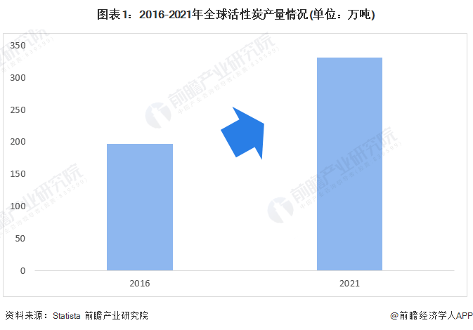 隨著全球活性炭技術(shù)的不斷發(fā)展,活性炭行業(yè)產(chǎn)能迅速增加。公眾對(duì)健康問(wèn)題的重視,助推活性炭產(chǎn)能逐年遞增。Statista數(shù)據(jù)顯示,全球活性炭總產(chǎn)量已從2016年的196.2萬(wàn)噸,增長(zhǎng)到2021年的331.1萬(wàn)噸。